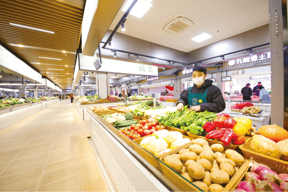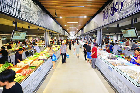 長(zhǎng)樂(lè)農(nóng)貿(mào)市場(chǎng),位于杭州市拱墅區(qū)商務(wù)辦公和居民生活的核心商圈,市場(chǎng)采用創(chuàng)新型“1+N”模式,即以社區(qū)智能生態(tài)化農(nóng)貿(mào)市場(chǎng)為核心,布局便民購(gòu)物商超、社區(qū)健康膳堂、宅配到家等服務(wù)業(yè)態(tài),打造真正的“一刻鐘便民生活圈”。